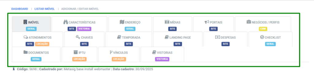 ✅ Imóvel: o cadastro de Imóvel foi totalmente reestruturado para oferecer uma navegação mais simples e prática no seu dia a dia. Agora, cada aba conta com etiquetas identificadoras, facilitando a visualização e compreensão do conteúdo.